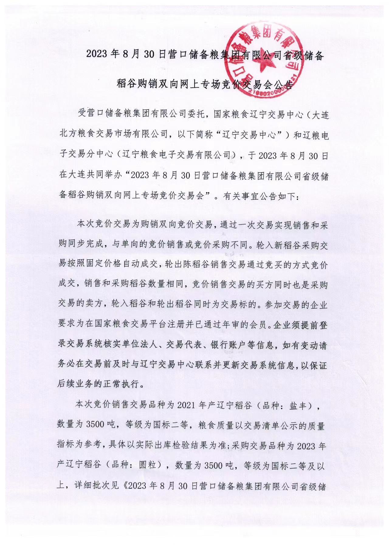 2023年8月30日营口储备粮集团有限公司省级储备稻谷购销双向网上专场竞价交易会公告