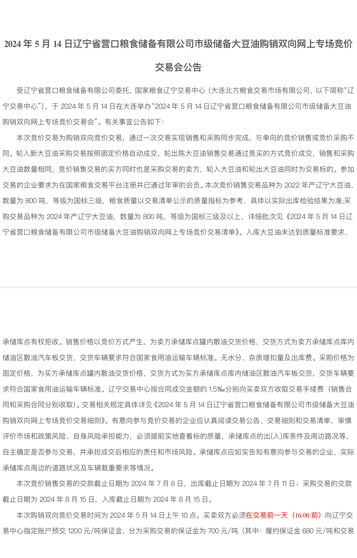 2024年5月14日辽宁省营口粮食储备有限公司市级储备大豆油购销双向网上专场竞价交易会公告