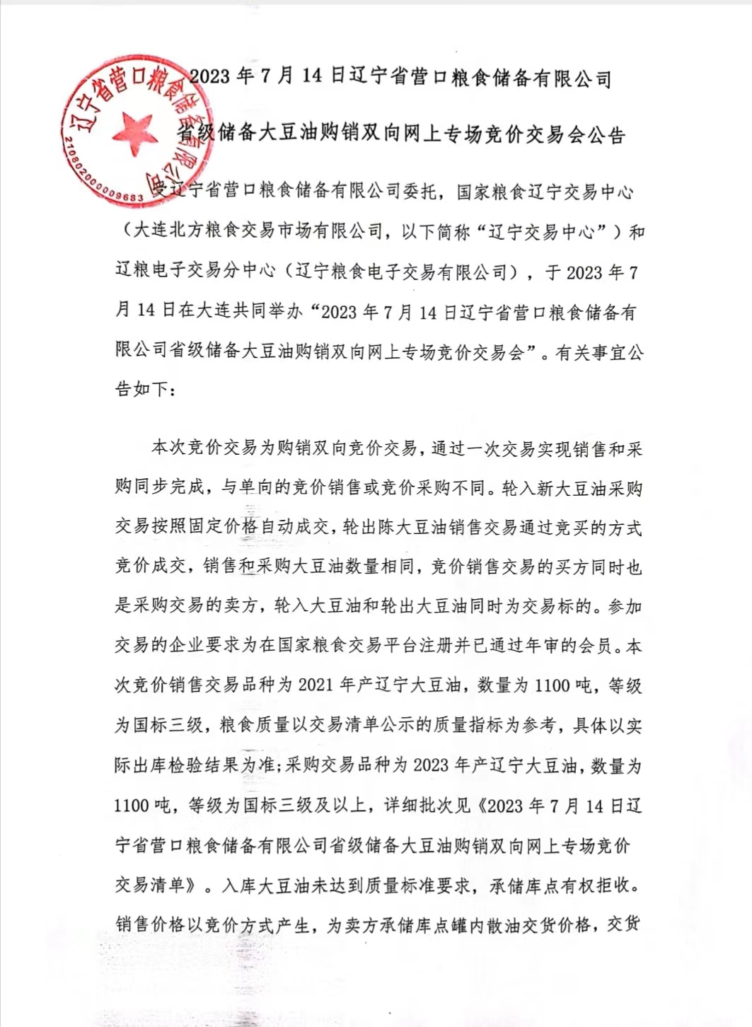 2023年7月14日辽宁省营口粮食储备有限公司省级储备大豆油购销双向网上专场竞价交易会公告