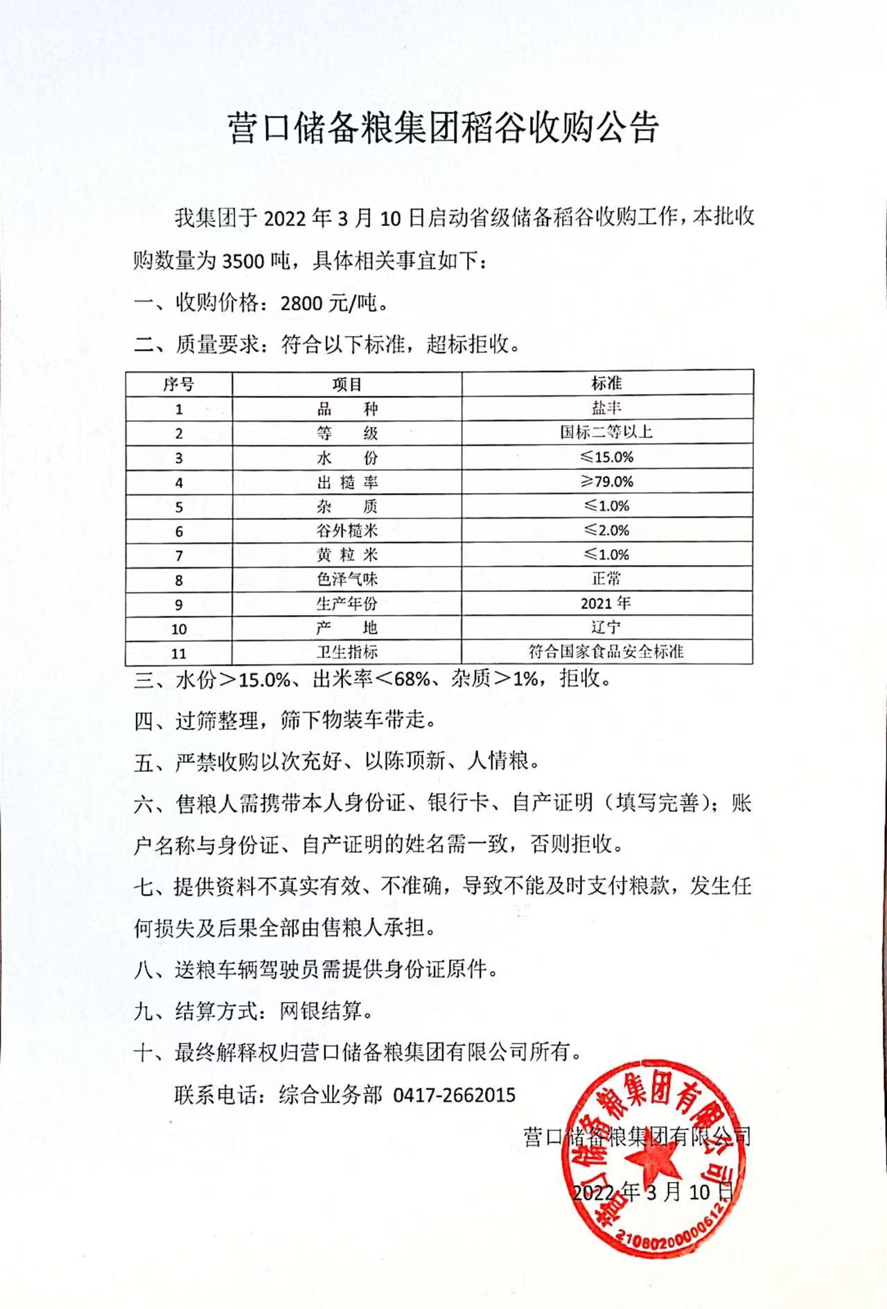 营口储备粮集团稻谷收购公告